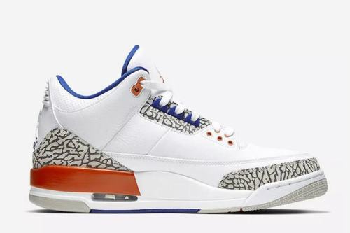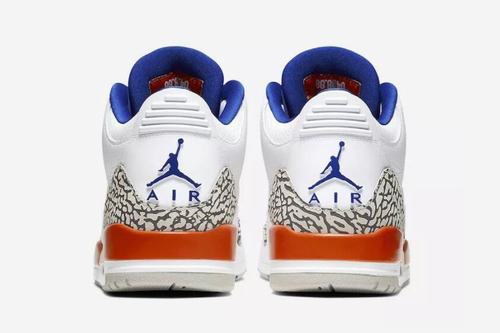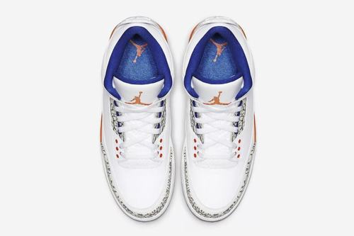 Air Jordan 3 Knicks shoes are dominated by white as a whole, retaining the most classic cement ash crack of Air Jordan 3. Details such as tongue, midsole, outsole and heel are added with the representative orange and blue embellishments of Knicks color matching. The tag is also a Knicks theme. The inside of the tongue is embellished with the words "04.0888" upside down, revealing the story behind this pair of shoes for us.